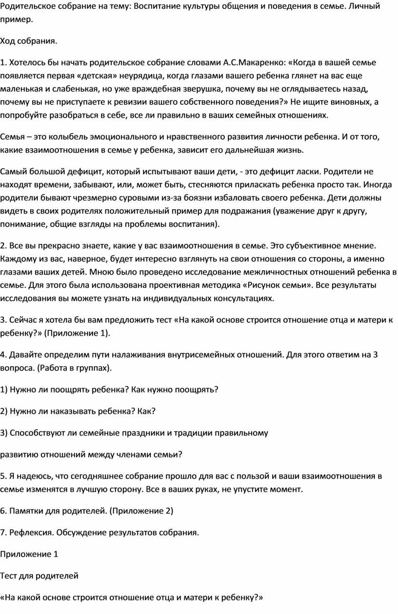 Родительское собрание на тему: Воспитание культуры общения и поведения в семье. Личный пример.