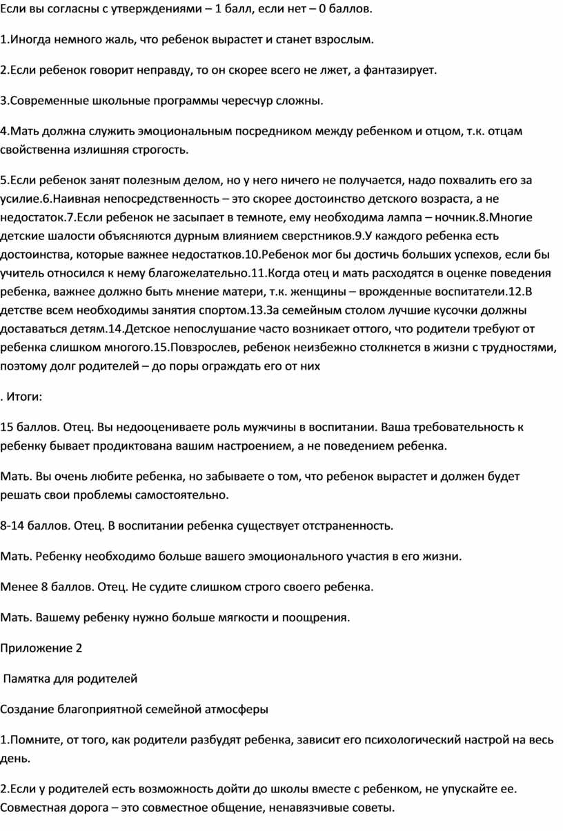 5.Если ребенок занят полезным делом, но у него ничего не получается, надо похвалить его за усилие.6.Наивная непосредственность – это скорее достоинство детского возраста, а не недостаток.7.Если ребенок не засыпает в темноте, ему необходима лампа – ночник.8.Многие детские шалости объясняются дурным влиянием сверстников.9.У каждого ребенка есть достоинства, которые важнее недостатков.10.Ребенок мог бы достичь больших успехов, если бы учитель относился к нему благожелательно.11.Когда отец и мать расходятся в оценке поведения ребенка, важнее должно быть мнение матери, т.к. женщины – врожденные воспитатели.12.В детстве всем необходимы занятия спортом.13.За семейным столом лучшие кусочки должны доставаться детям.14.Детское непослушание часто возникает оттого, что родители требуют от ребенка слишком многого.15.Повзрослев, ребенок неизбежно столкнется в жизни с трудностями, поэтому долг родителей – до поры ограждать его от них