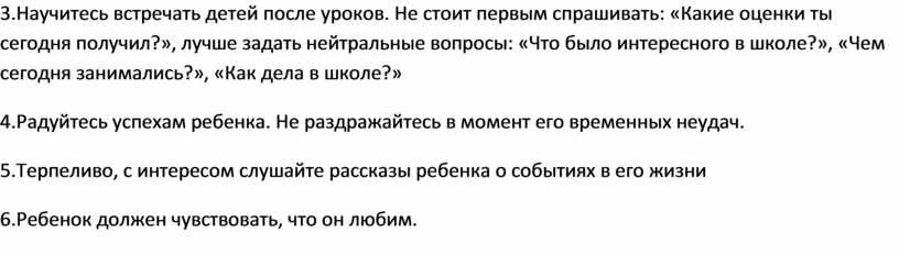 3.Научитесь встречать детей после уроков. Не стоит первым спрашивать: «Какие оценки ты сегодня получил?», лучше задать нейтральные вопросы: «Что было интересного в школе?», «Чем сегодня занимались?», «Как дела в школе?»