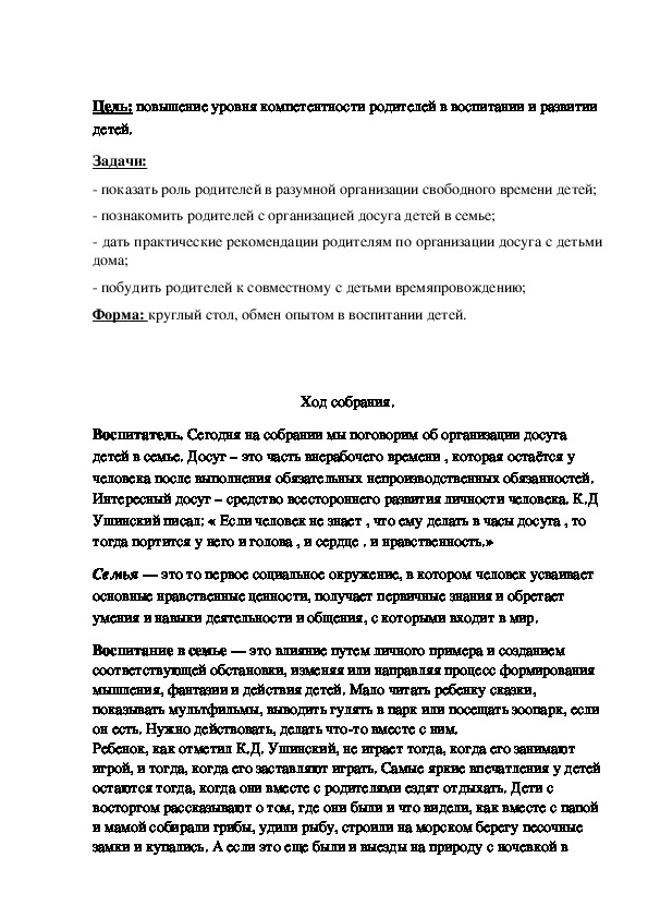 Воспитатель. Сегодня на собрании мы поговорим об организации досуга