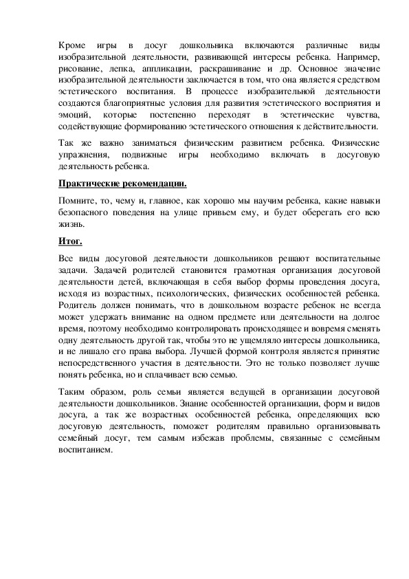 досуга, а так же возрастных особенностей ребенка, определяющих всю