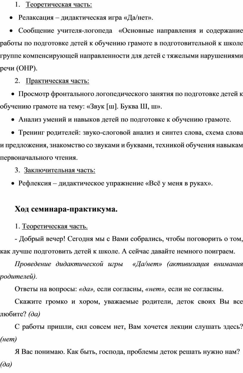 Родительское собрание на тему: «Подготовка детей к обучению грамоте» в форме семинара-практикума в подготовительной к школе группе компенсирующей направленности для детей с тяжелыми нарушениями речи (ОНР).