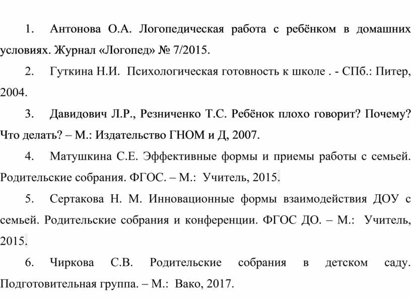 1. Антонова О.А. Логопедическая работа с ребёнком в домашних условиях. Журнал «Логопед» № 7/2015.