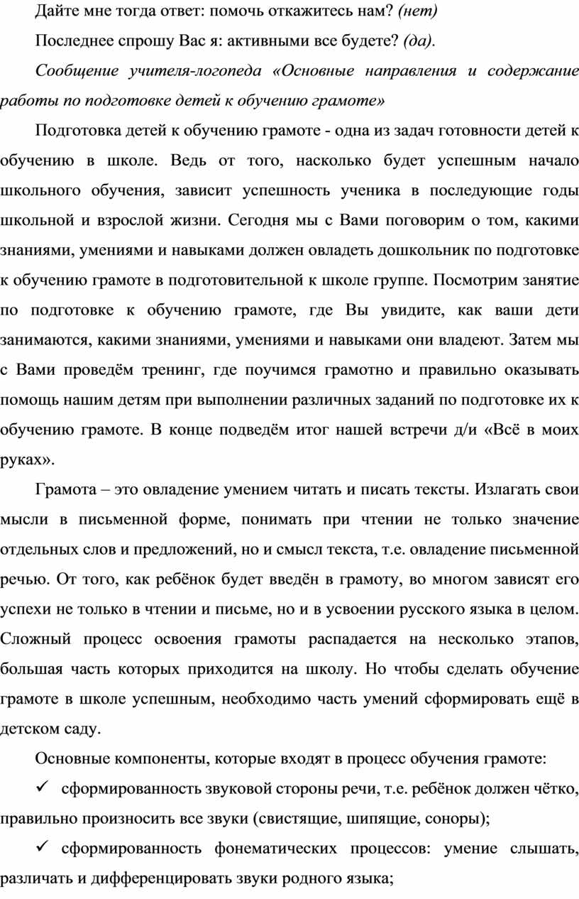 Сообщение учителя-логопеда «Основные направления и содержание работы по подготовке детей к обучению грамоте»