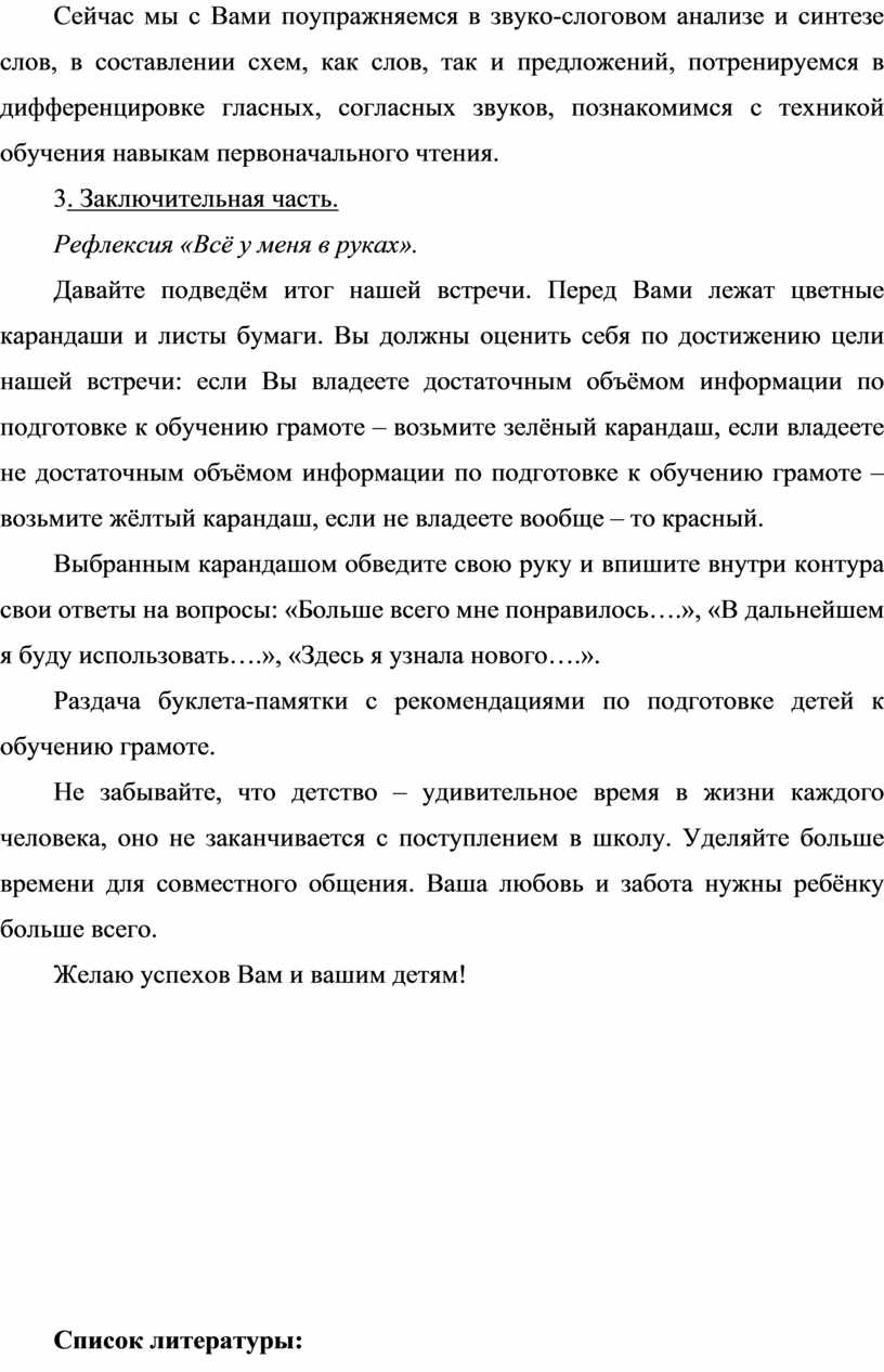 Давайте подведём итог нашей встречи. Перед Вами лежат цветные карандаши и листы бумаги. Вы должны оценить себя по достижению цели нашей встречи: если Вы владеете достаточным объёмом информации по подготовке к обучению грамоте – возьмите зелёный карандаш, если владеете не достаточным объёмом информации по подготовке к обучению грамоте – возьмите жёлтый карандаш, если не владеете вообще – то красный.