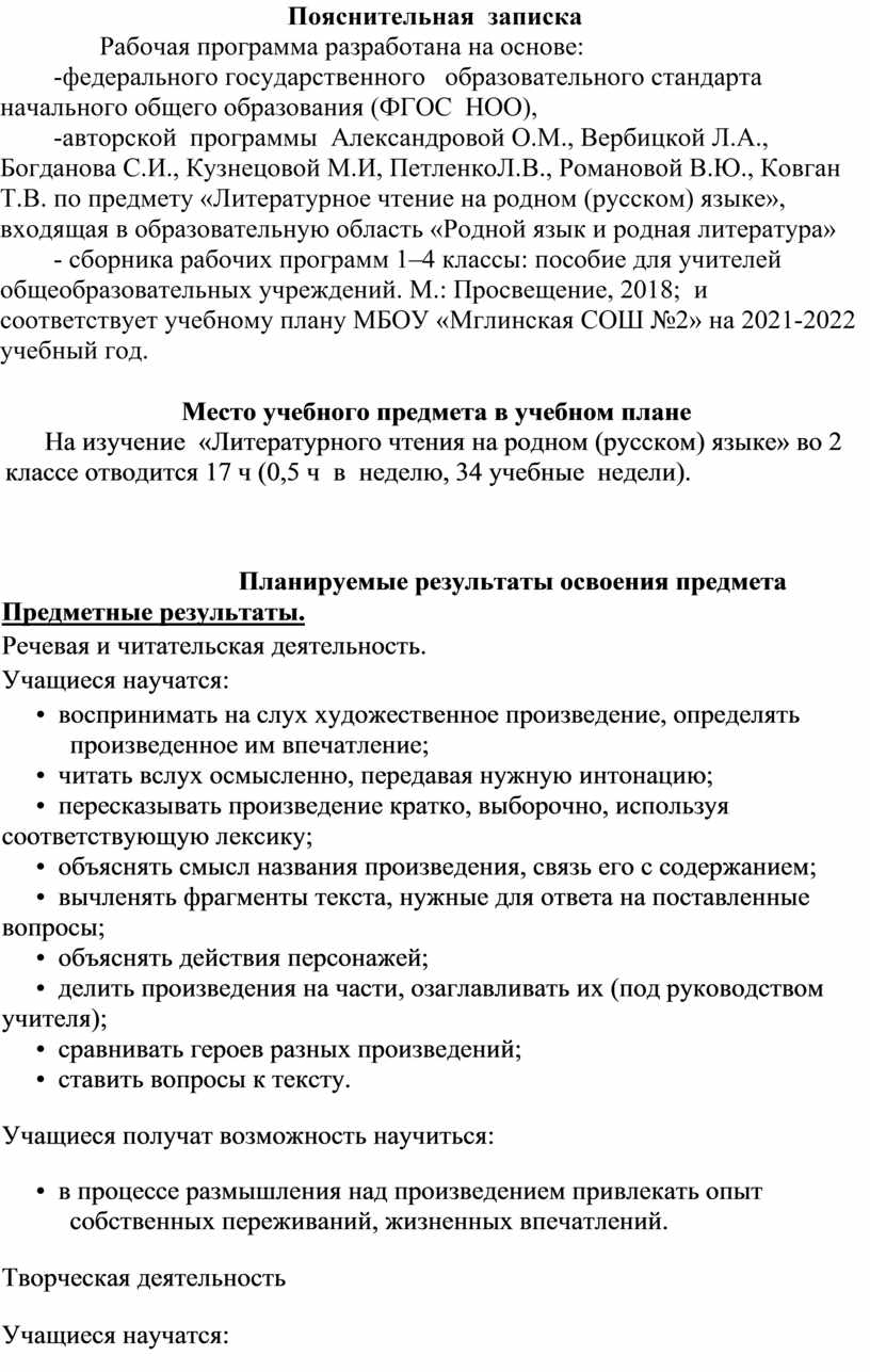 -авторской программы Александровой О.М., Вербицкой Л.А., Богданова С.И., Кузнецовой М.И, ПетленкоЛ.В., Романовой В.Ю., Ковган Т.В. по предмету «Литературное чтение на родном (русском) языке», входящая в образовательную область «Родной язык и родная литература»