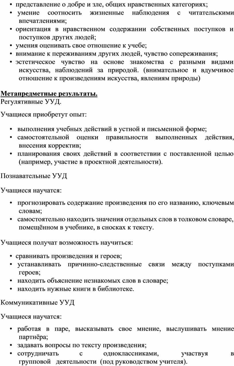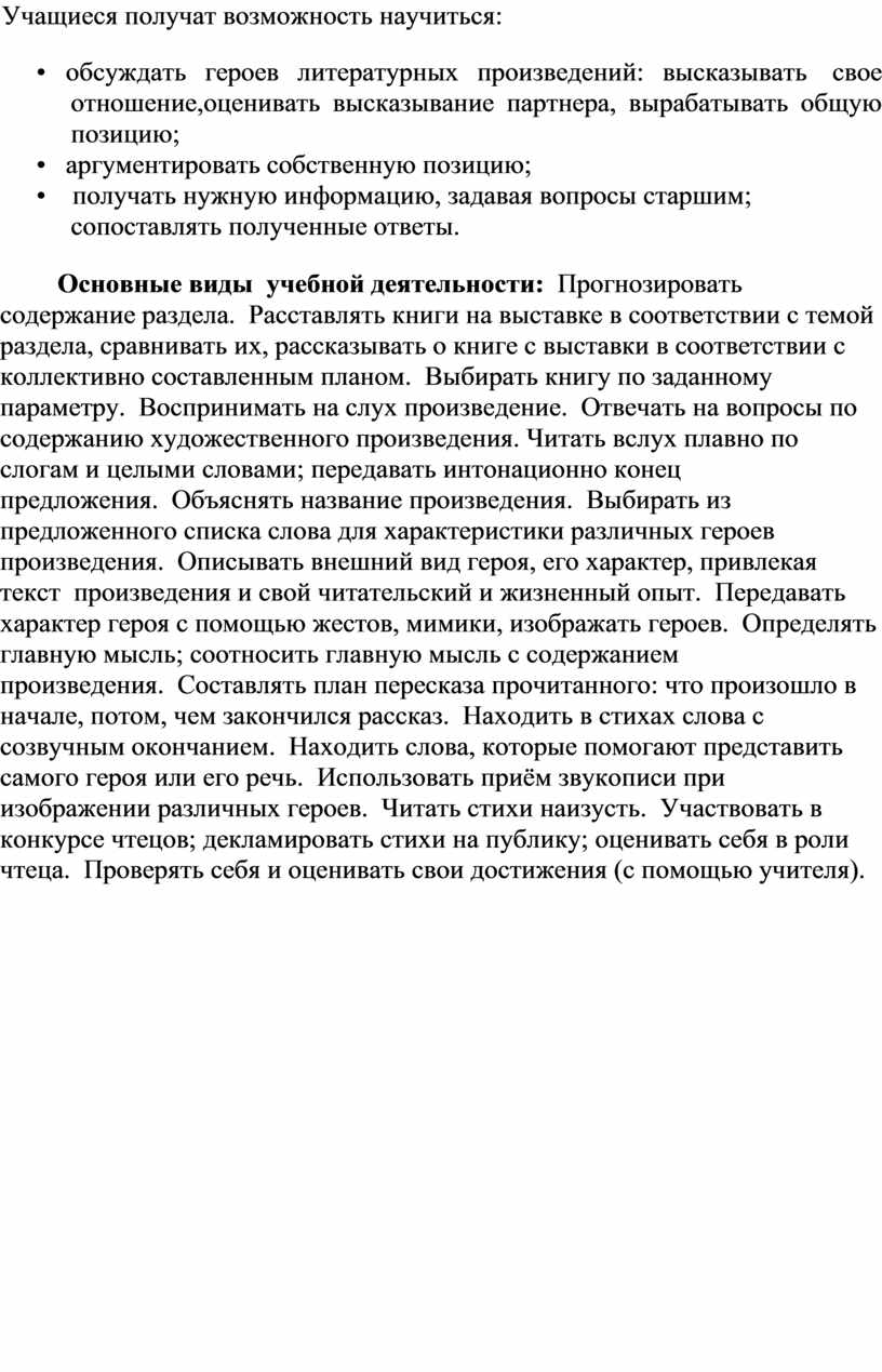 Основные виды учебной деятельности: Прогнозировать содержание раздела. Расставлять книги на выставке в соответствии с темой раздела, сравнивать их, рассказывать о книге с выставки в соответствии с коллективно составленным планом. Выбирать книгу по заданному параметру. Воспринимать на слух произведение. Отвечать на вопросы по содержанию художественного произведения. Читать вслух плавно по слогам и целыми словами; передавать интонационно конец предложения. Объяснять название произведения. Выбирать из предложенного списка слова для характеристики различных героев произведения. Описывать внешний вид героя, его характер, привлекая текст произведения и свой читательский и жизненный опыт. Передавать характер героя с помощью жестов, мимики, изображать героев. Определять главную мысль; соотносить главную мысль с содержанием произведения. Составлять план пересказа прочитанного: что произошло в начале, потом, чем закончился рассказ. Находить в стихах слова с созвучным окончанием. Находить слова, которые помогают представить самого героя или его речь. Использовать приём звукописи при изображении различных героев. Читать стихи наизусть. Участвовать в конкурсе чтецов; декламировать стихи на публику; оценивать себя в роли чтеца. Проверять себя и оценивать свои достижения (с помощью учителя).