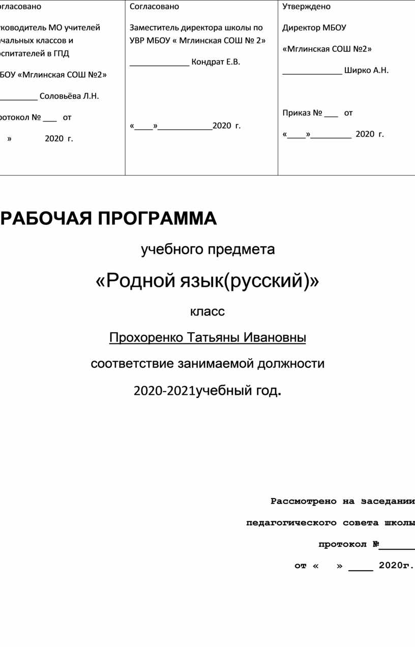 Согласовано Руководитель МО учителей начальных классов и воспитателей в ГПД МБОУ «Мглинская СОШ №2» __________ Соловьёва Л.Н. Протокол № ___ от « » 2020 г.