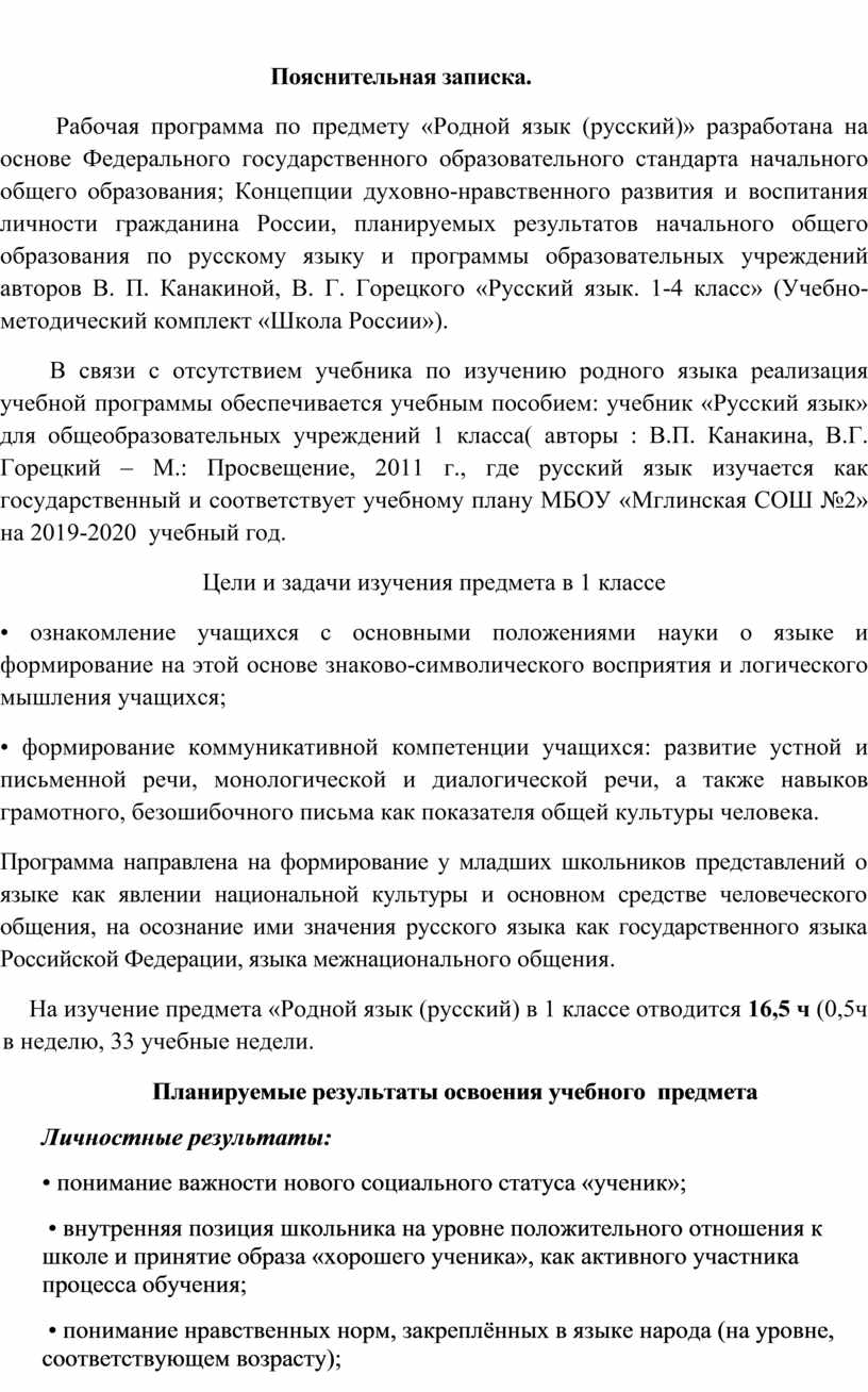 В связи с отсутствием учебника по изучению родного языка реализация учебной программы обеспечивается учебным пособием: учебник «Русский язык» для общеобразовательных учреждений 1 класса( авторы : В.П. Канакина, В.Г. Горецкий – М.: Просвещение, 2011 г., где русский язык изучается как государственный и соответствует учебному плану МБОУ «Мглинская СОШ №2» на 2019-2020 учебный год.