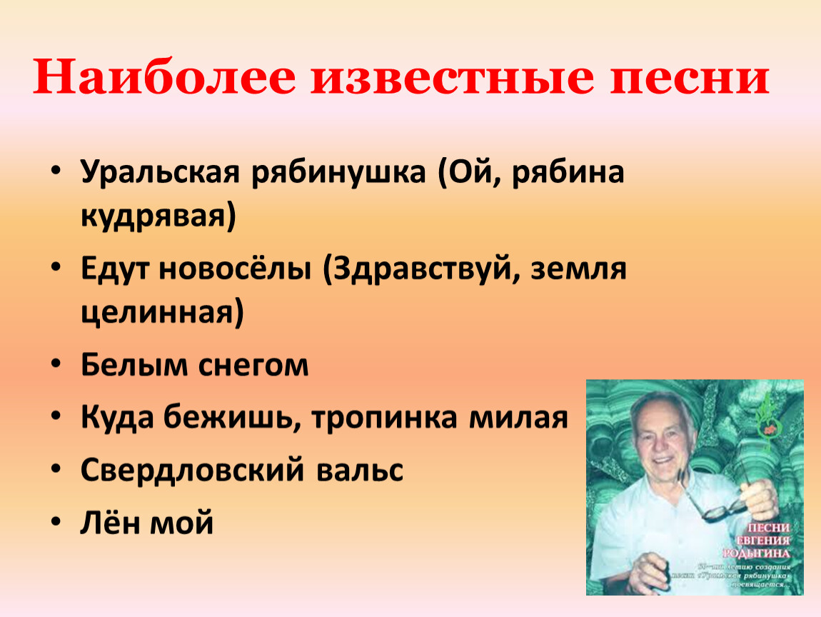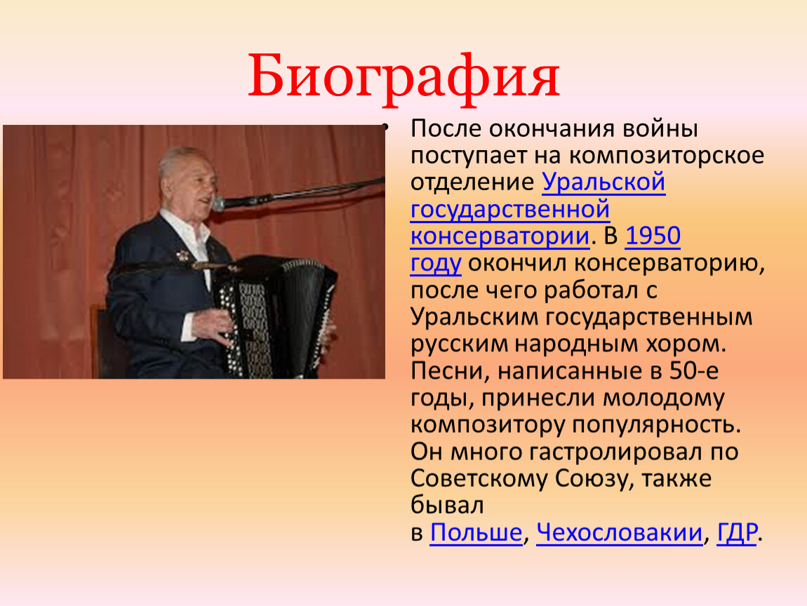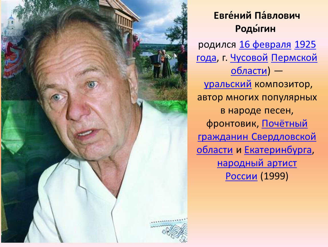 родился 16 февраля 1925 года, г. Чусовой Пермской области) — уральский композитор, автор многих популярных в народе песен, фронтовик, Почётный гражданин Свердловской области и Екатеринбурга, народный артист России (1999)