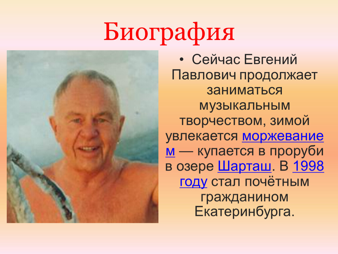 Сейчас Евгений Павлович продолжает заниматься музыкальным творчеством, зимой увлекается моржеванием — купается в проруби в озере Шарташ. В 1998 году стал почётным гражданином Екатеринбурга.