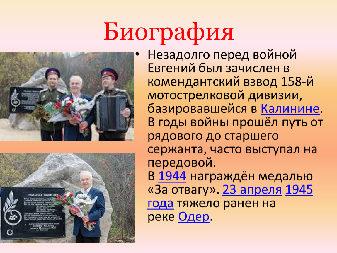 Незадолго перед войной Евгений был зачислен в комендантский взвод 158-й мотострелковой дивизии, базировавшейся в Калинине. В годы войны прошёл путь от рядового до старшего сержанта, часто выступал на передовой. В 1944 награждён медалью «За отвагу». 23 апреля 1945 года тяжело ранен на реке Одер.