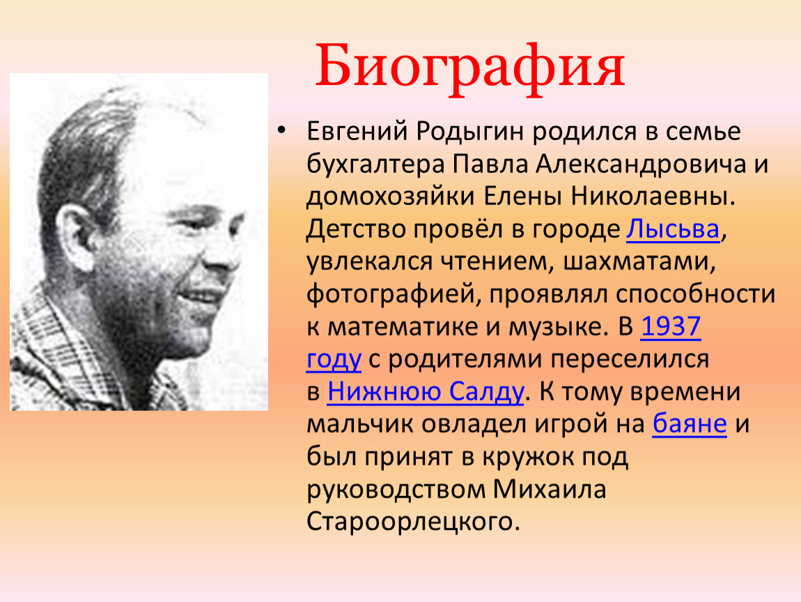 Евгений Родыгин родился в семье бухгалтера Павла Александровича и домохозяйки Елены Николаевны. Детство провёл в городе Лысьва, увлекался чтением, шахматами, фотографией, проявлял способности к математике и музыке. В 1937 году с родителями переселился в Нижнюю Салду. К тому времени мальчик овладел игрой на баяне и был принят в кружок под руководством Михаила Староорлецкого.