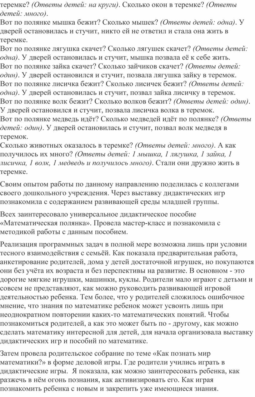 Затем провела родительское собрание по теме «Как познать мир математики?» в форме деловой игры. Где родители учились играть в дидактические игры. Я показала, как можно заинтересовать ребенка, как разжечь в нём огонь познания, как активизировать его. Как играя познакомить ребенка с новым и закрепить уже имеющиеся знания.