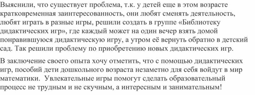 Выяснили, что существует проблема, т.к. у детей еще в этом возрасте кратковременная заинтересованность, они любят сменять деятельность, любят играть в разные игры, решили создать в группе «Библиотеку дидактических игр», где каждый может на один вечер взять домой понравившуюся дидактическую игру, а утром её вернуть обратно в детский сад. Так решили проблему по приобретению новых дидактических игр.