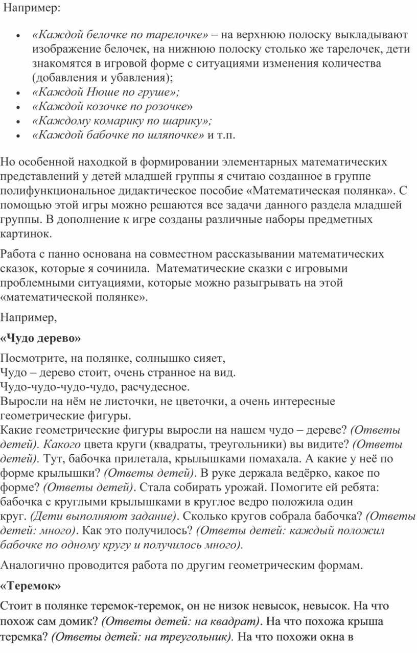 Работа с панно основана на совместном рассказывании математических сказок, которые я сочинила. Математические сказки с игровыми проблемными ситуациями, которые можно разыгрывать на этой «математической полянке».