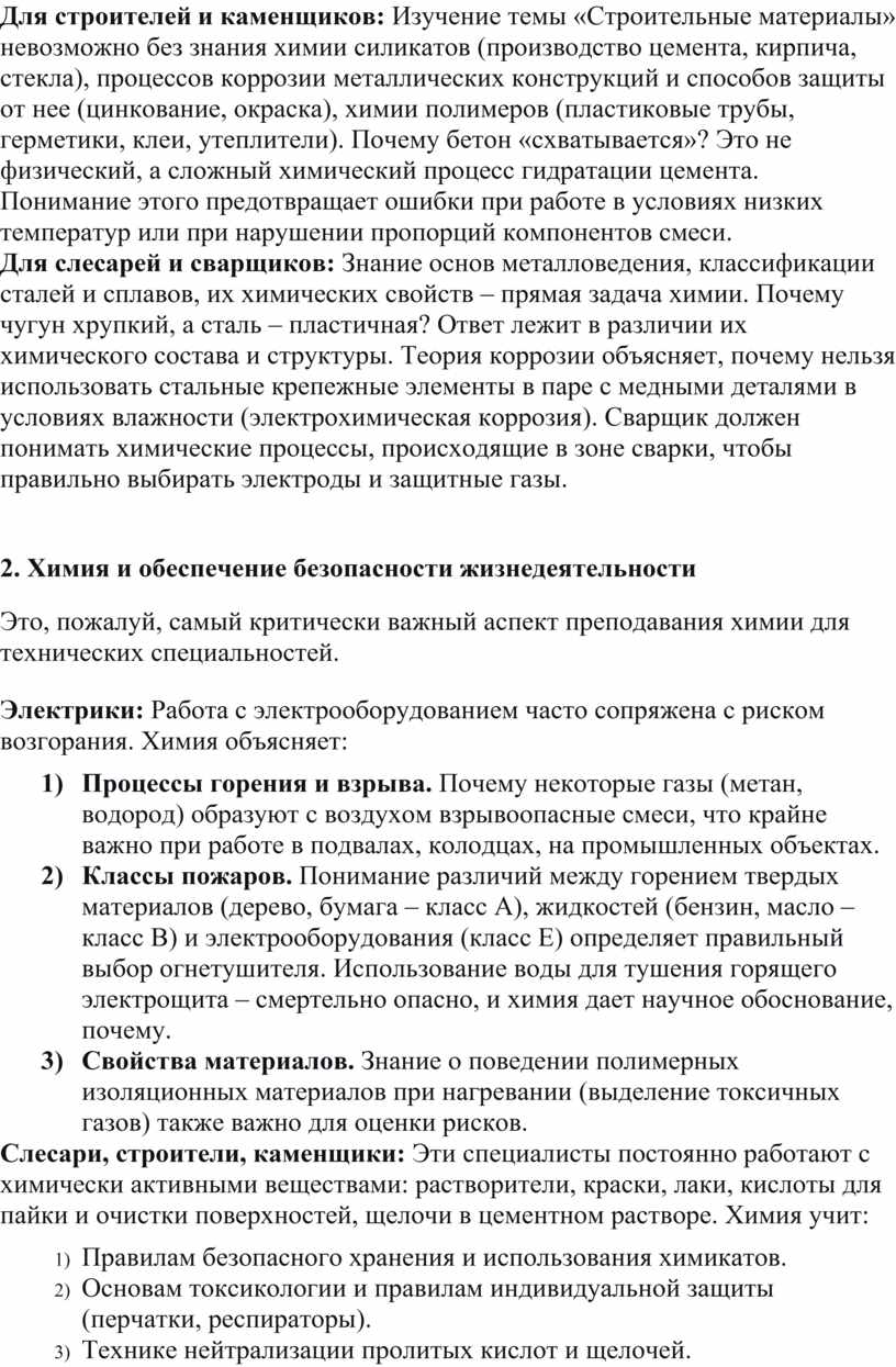 1. Контекстное обучение: Каждую тему следует начинать не с теории, а с профессиональной проблемы. «Почему ржавеет арматура в бетоне и как это предотвратить?» → Изучаем коррозию металлов. «Почему при коротком замыкании пластмассовый корпус прибора может загореться?» → Изучаем горение и свойства полимеров.