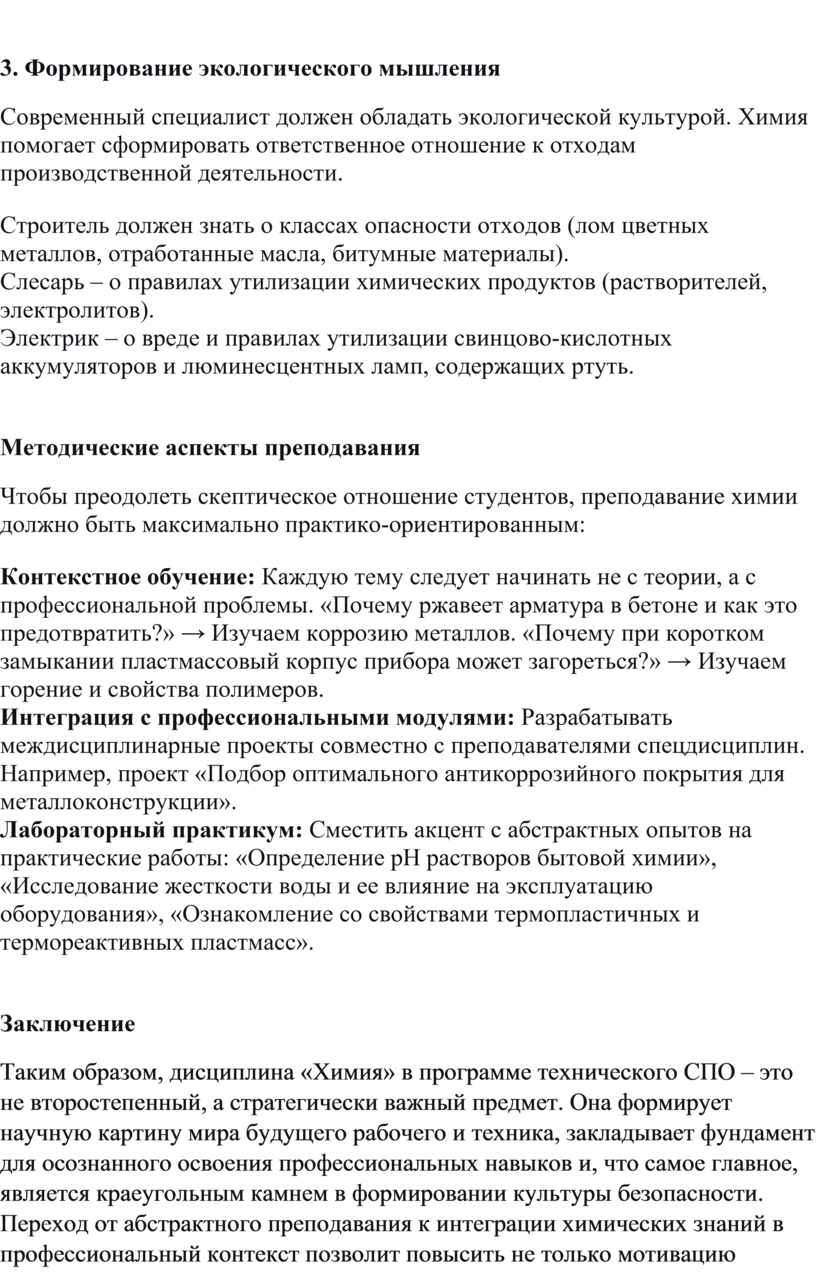 Таким образом, дисциплина «Химия» в программе технического СПО – это не второстепенный, а стратегически важный предмет. Она формирует научную картину мира будущего рабочего и техника, закладывает фундамент для осознанного освоения профессиональных навыков и, что самое главное, является краеугольным камнем в формировании культуры безопасности. Переход от абстрактного преподавания к интеграции химических знаний в профессиональный контекст позволит повысить не только мотивацию студентов, но и качество подготовки высококвалифицированных, грамотных и востребованных на современном рынке труда специалистов.