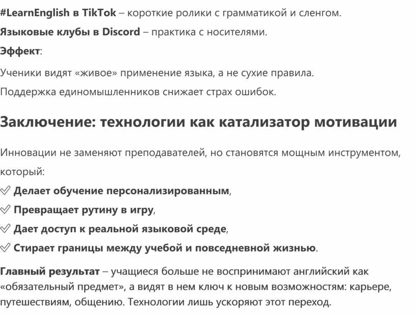 Главный результат – учащиеся больше не воспринимают английский как «обязательный предмет», а видят в нем ключ к новым возможностям: карьере, путешествиям, общению. Технологии лишь ускоряют этот переход.
