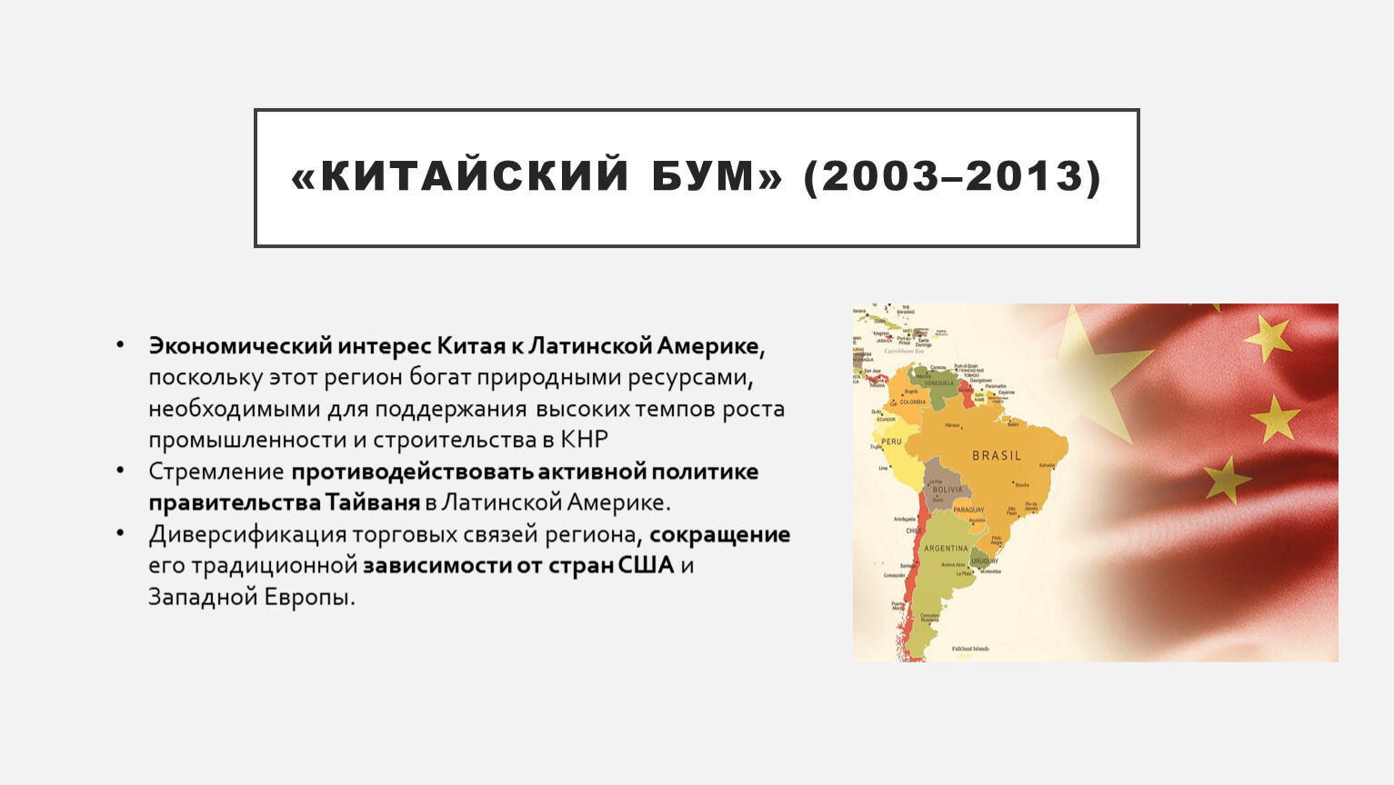 Экономический интерес Китая к Латинской Америке, поскольку этот регион богат природными ресурсами, необходимыми для поддержания высоких темпов роста промышленности и строительства в КНР