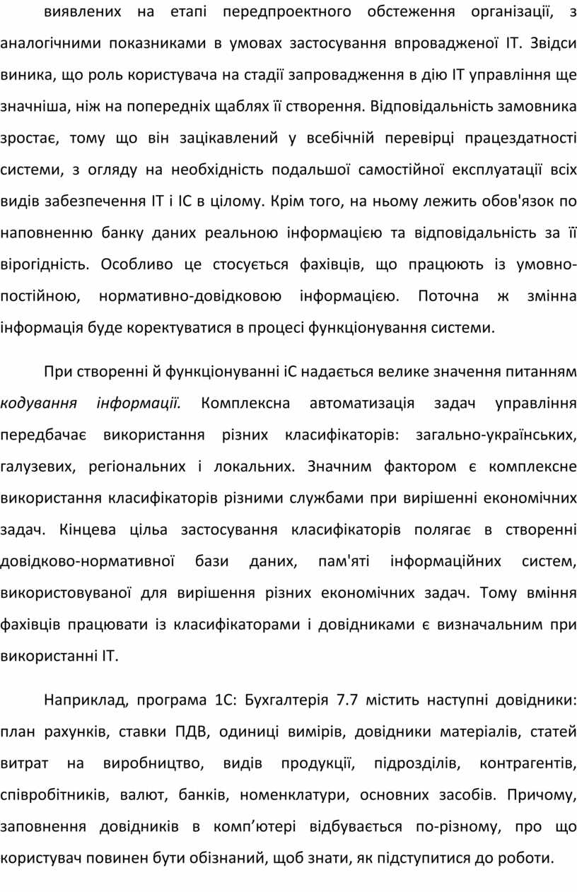 При створенні й функціонуванні іС надається велике значення питанням кодування інформації. Комплексна автоматизація задач управління передбачає використання різних класифікаторів: загально-українських, галузевих, регіональних і локальних. Значним фактором є комплексне використання класифікаторів різними службами при вирішенні економічних задач. Кінцева цільа застосування класифікаторів полягає в створенні довідково-нормативної бази даних, пам'яті інформаційних систем, використовуваної для вирішення різних економічних задач. Тому вміння фахівців працювати із класифікаторами і довідниками є визначальним при використанні ІТ.