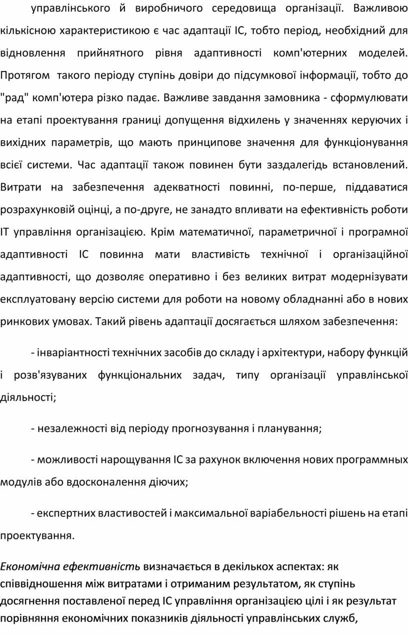 Адаптаційні властивості системи відбивають її здатність пристосовуватися до зміни навколишнього зовнішнього тла й внутрішнього управлінського й виробничого середовища організації. Важливою кількісною характеристикою є час адаптації ІC, тобто період, необхідний для відновлення прийнятного рівня адаптивності комп'ютерних моделей. Протягом такого періоду ступінь довіри до підсумкової інформації, тобто до "рад" комп'ютера різко падає. Важливе завдання замовника - сформулювати на етапі проектування границі допущення відхилень у значеннях керуючих і вихідних параметрів, що мають принципове значення для функціонування всієї системи. Час адаптації також повинен бути заздалегідь встановлений. Витрати на забезпечення адекватності повинні, по-перше, піддаватися розрахунковій оцінці, а по-друге, не занадто впливати на ефективність роботи ІТ управління організацією. Крім математичної, параметричної і програмної адаптивності ІС повинна мати властивість технічної і організаційної адаптивності, що дозволяє оперативно і без великих витрат модернізувати експлуатовану версію системи для роботи на новому обладнанні або в нових ринкових умовах. Такий рівень адаптації досягається шляхом забезпечення: