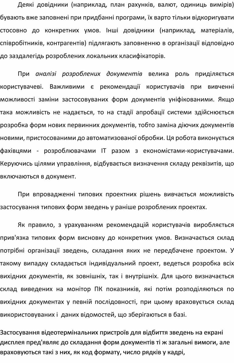 Як правило, з урахуванням рекомендацій користувачів виробляється прив'язка типових форм висновку до конкретних умов. Визначається склад потрібні організації зведень, складання яких не передбачене проектом. У такому випадку складається індивідуальний проект, ведеться розробка всіх вихідних документів, як зовнішніх, так і внутрішніх. Для цього визначається склад виведених на монітор ПК показників, які потім розподіляються по вихідних документах у певній послідовності, при цьому враховується склад використовуваних і даних відомостей, що зберігаються в базі.