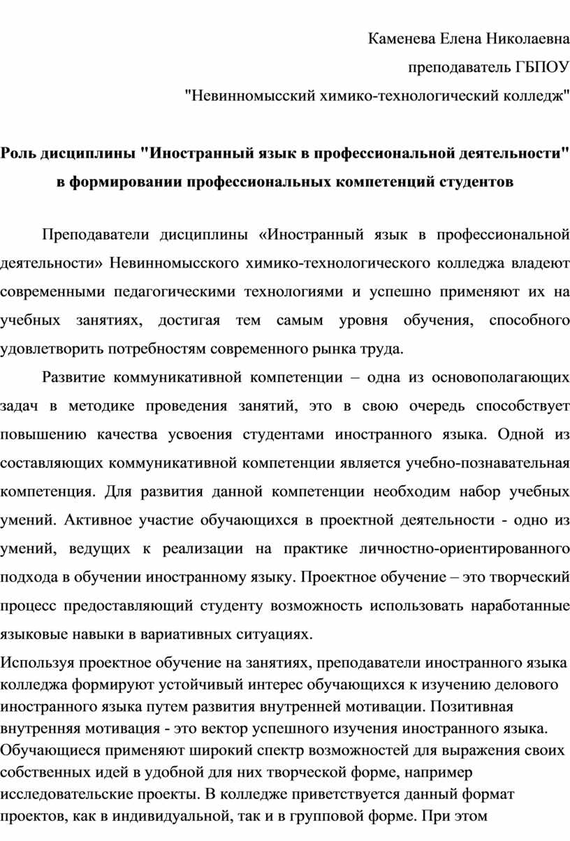 Роль дисциплины "Иностранный язык в профессиональной деятельности" в формировании профессиональных компетенций студентов