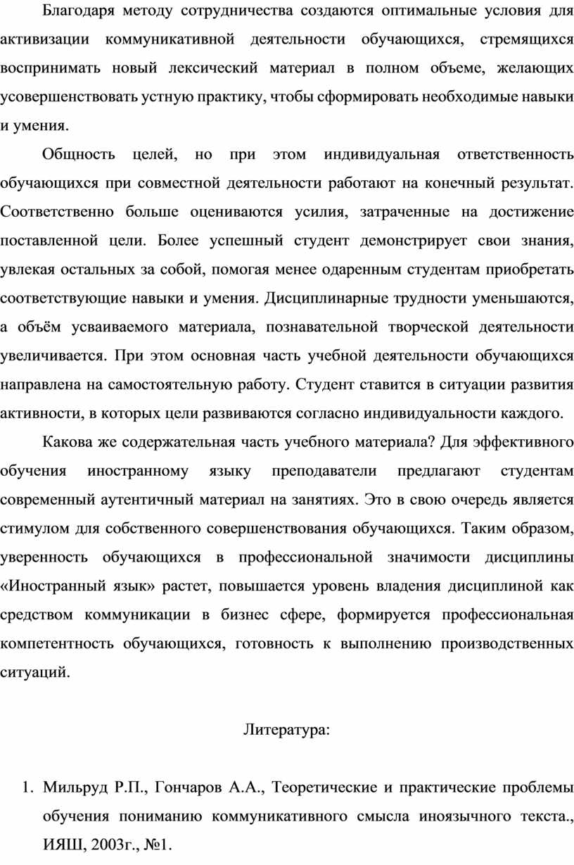 Благодаря методу сотрудничества создаются оптимальные условия для активизации коммуникативной деятельности обучающихся, стремящихся воспринимать новый лексический материал в полном объеме, желающих усовершенствовать устную практику, чтобы сформировать необходимые навыки и умения.