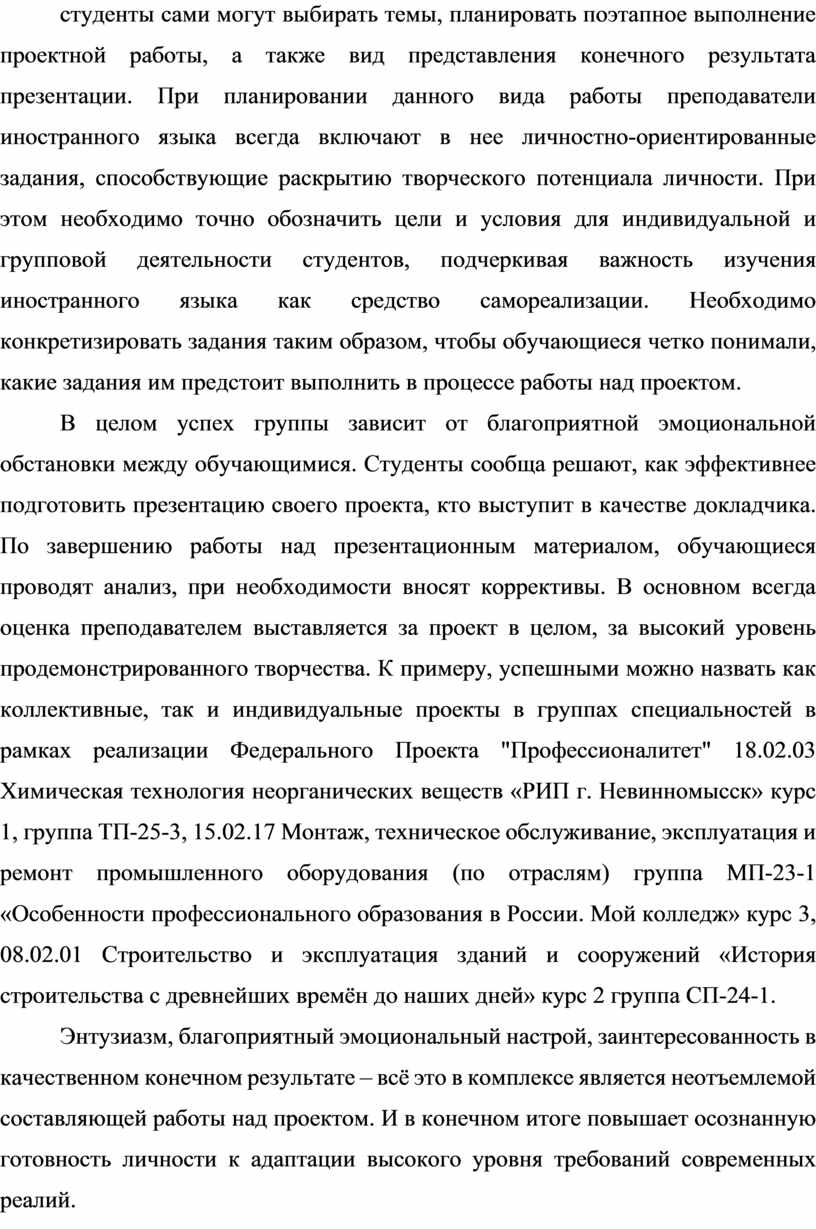В целом успех группы зависит от благоприятной эмоциональной обстановки между обучающимися. Студенты сообща решают, как эффективнее подготовить презентацию своего проекта, кто выступит в качестве докладчика. По завершению работы над презентационным материалом, обучающиеся проводят анализ, при необходимости вносят коррективы. В основном всегда оценка преподавателем выставляется за проект в целом, за высокий уровень продемонстрированного творчества. К примеру, успешными можно назвать как коллективные, так и индивидуальные проекты в группах специальностей в рамках реализации Федерального Проекта "Профессионалитет" 18.02.03 Химическая технология неорганических веществ «РИП г. Невинномысск» курс 1, группа ТП-25-3, 15.02.17 Монтаж, техническое обслуживание, эксплуатация и ремонт промышленного оборудования (по отраслям) группа МП-23-1 «Особенности профессионального образования в России. Мой колледж» курс 3, 08.02.01 Строительство и эксплуатация зданий и сооружений «История строительства с древнейших времён до наших дней» курс 2 группа СП-24-1.
