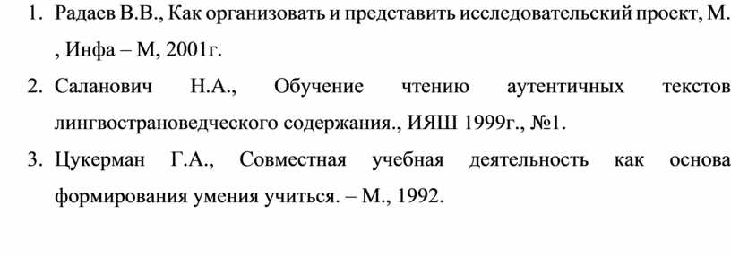 2. Радаев В.В., Как организовать и представить исследовательский проект, М. , Инфа – М, 2001г.