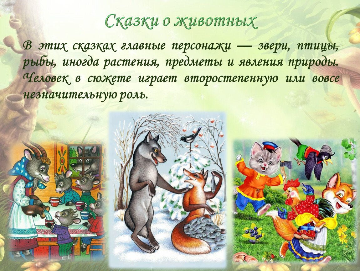 В этих сказках главные персонажи — звери, птицы, рыбы, иногда растения, предметы и явления природы. Человек в сюжете играет второстепенную или вовсе незначительную роль.