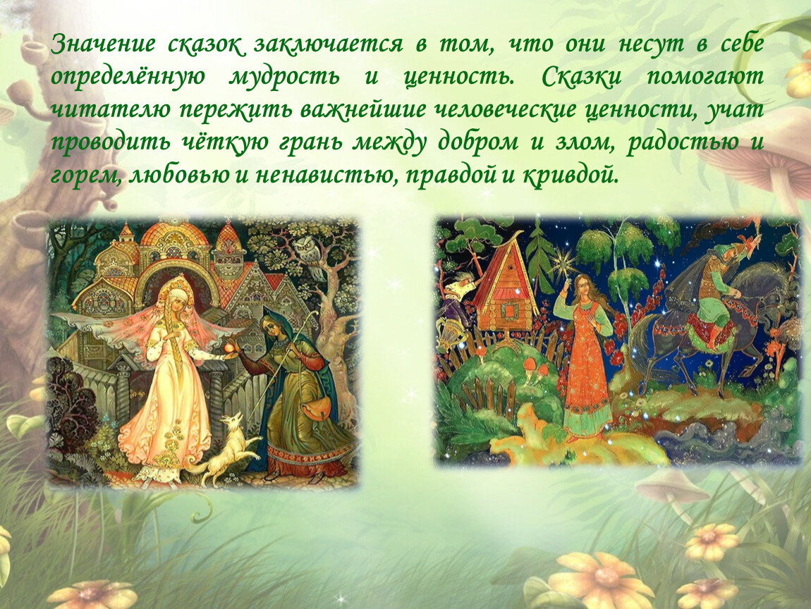 Значение сказок заключается в том, что они несут в себе определённую мудрость и ценность. Сказки помогают читателю пережить важнейшие человеческие ценности, учат проводить чёткую грань между добром и злом, радостью и горем, любовью и ненавистью, правдой и кривдой.