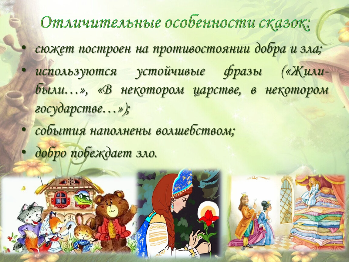 используются устойчивые фразы («Жили-были…», «В некотором царстве, в некотором государстве…»);