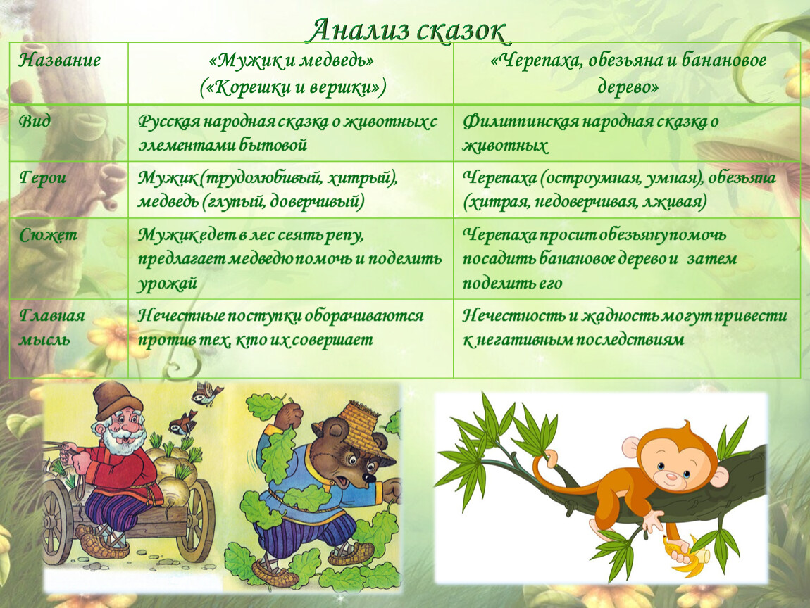 Герои | Мужик (трудолюбивый, хитрый), медведь (глупый, доверчивый) | Черепаха (остроумная, умная), обезьяна (хитрая, недоверчивая, лживая) |