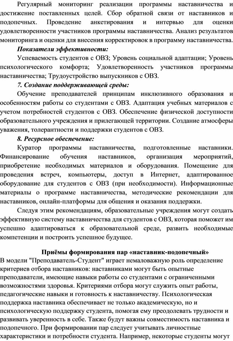 Следуя этим рекомендациям, образовательные учреждения могут создать эффективную систему наставничества для студентов с ОВЗ, которая поможет им успешно адаптироваться к образовательной среде, развить необходимые компетенции и построить успешное будущее.