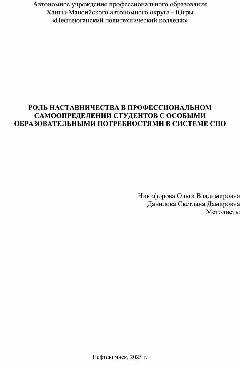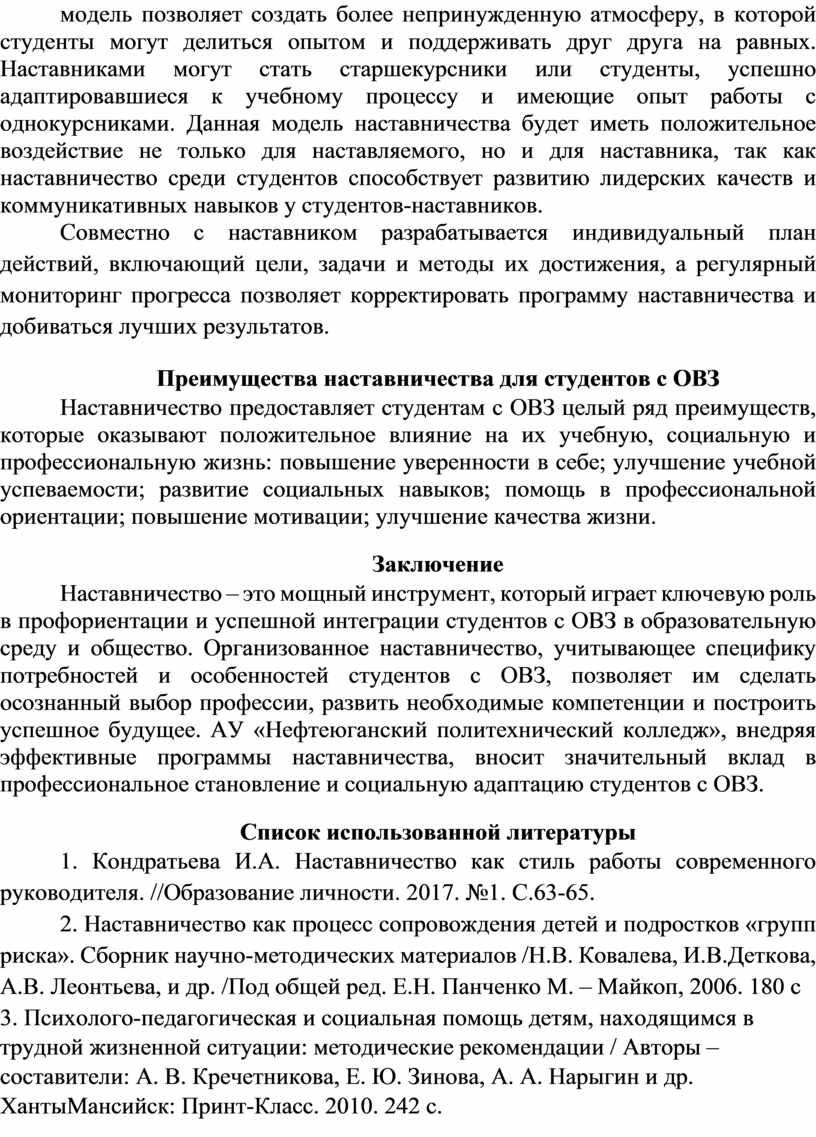 Наставничество – это мощный инструмент, который играет ключевую роль в профориентации и успешной интеграции студентов с ОВЗ в образовательную среду и общество. Организованное наставничество, учитывающее специфику потребностей и особенностей студентов с ОВЗ, позволяет им сделать осознанный выбор профессии, развить необходимые компетенции и построить успешное будущее. АУ «Нефтеюганский политехнический колледж», внедряя эффективные программы наставничества, вносит значительный вклад в профессиональное становление и социальную адаптацию студентов с ОВЗ.
