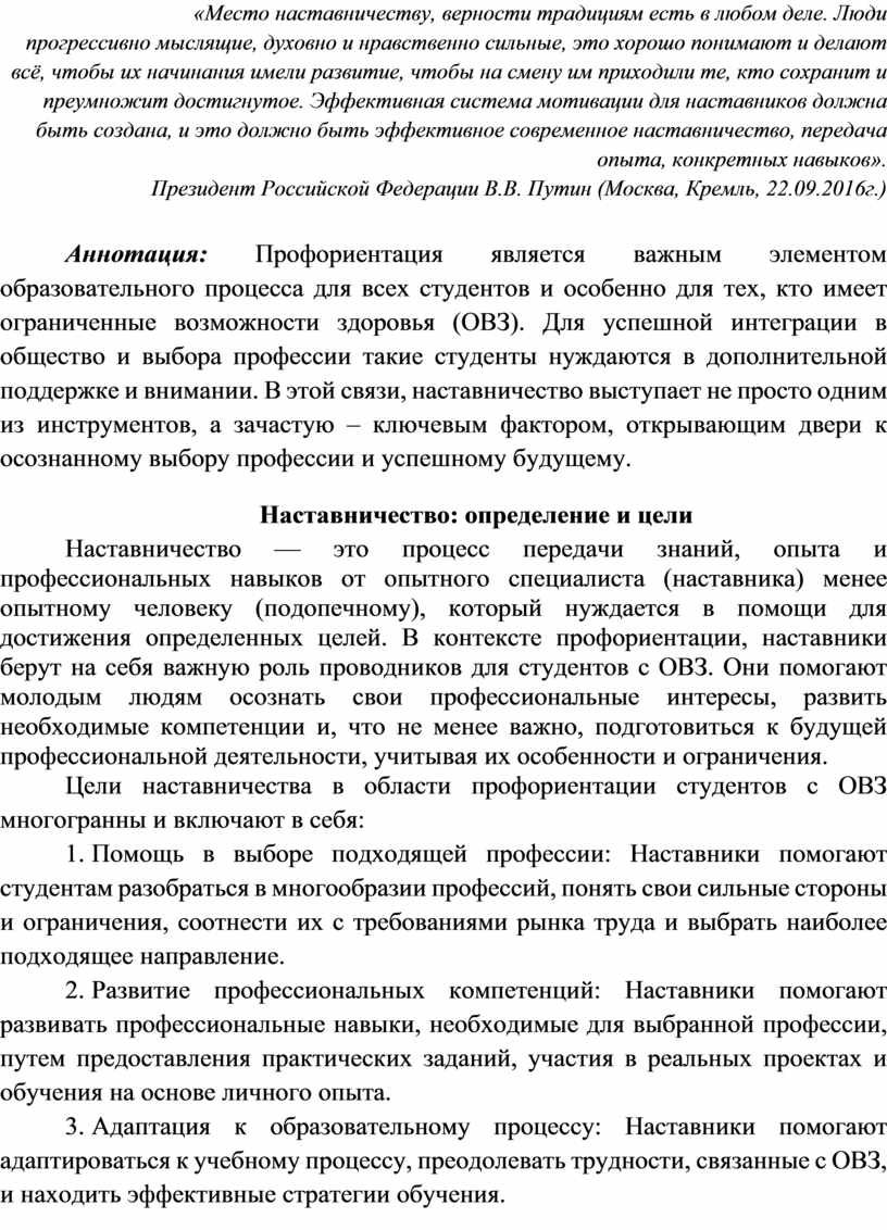 Наставничество — это процесс передачи знаний, опыта и профессиональных навыков от опытного специалиста (наставника) менее опытному человеку (подопечному), который нуждается в помощи для достижения определенных целей. В контексте профориентации, наставники берут на себя важную роль проводников для студентов с ОВЗ. Они помогают молодым людям осознать свои профессиональные интересы, развить необходимые компетенции и, что не менее важно, подготовиться к будущей профессиональной деятельности, учитывая их особенности и ограничения.