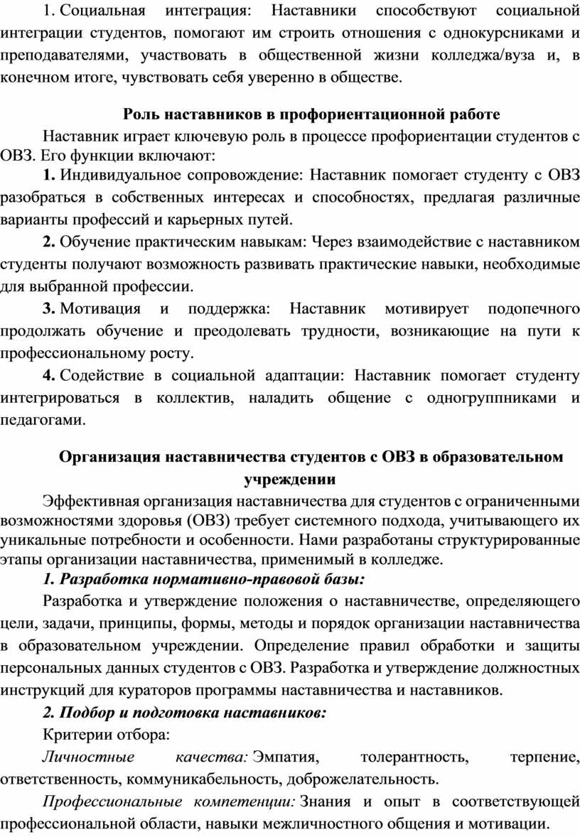 3. Адаптация к образовательному процессу: Наставники помогают адаптироваться к учебному процессу, преодолевать трудности, связанные с ОВЗ, и находить эффективные стратегии обучения.