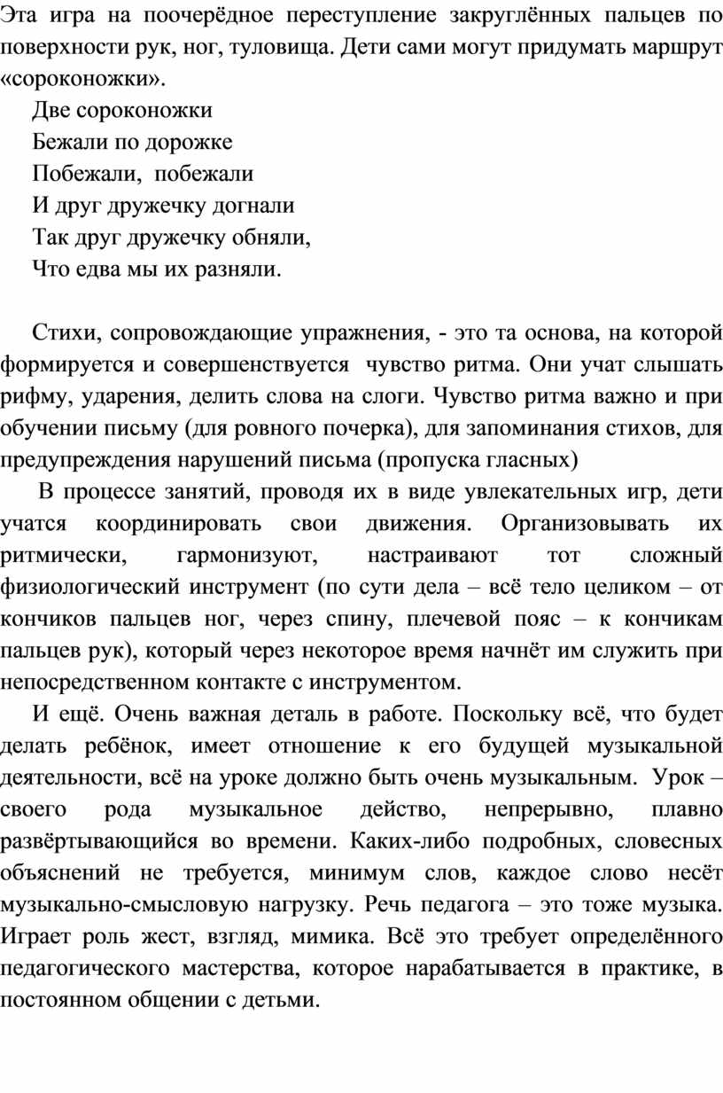 В процессе занятий, проводя их в виде увлекательных игр, дети учатся координировать свои движения. Организовывать их ритмически, гармонизуют, настраивают тот сложный физиологический инструмент (по сути дела – всё тело целиком – от кончиков пальцев ног, через спину, плечевой пояс – к кончикам пальцев рук), который через некоторое время начнёт им служить при непосредственном контакте с инструментом.
