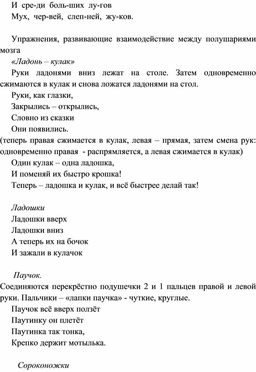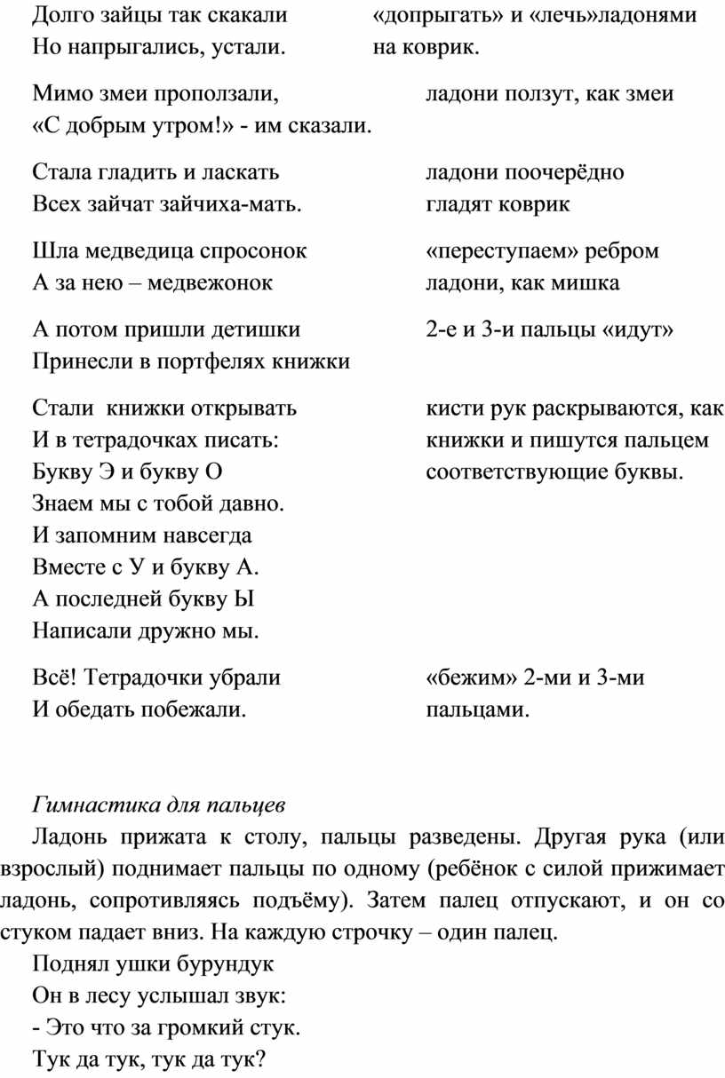 Стихи, сопровождающие упражнения, - это та основа, на которой формируется и совершенствуется чувство ритма. Они учат слышать рифму, ударения, делить слова на слоги. Чувство ритма важно и при обучении письму (для ровного почерка), для запоминания стихов, для предупреждения нарушений письма (пропуска гласных)