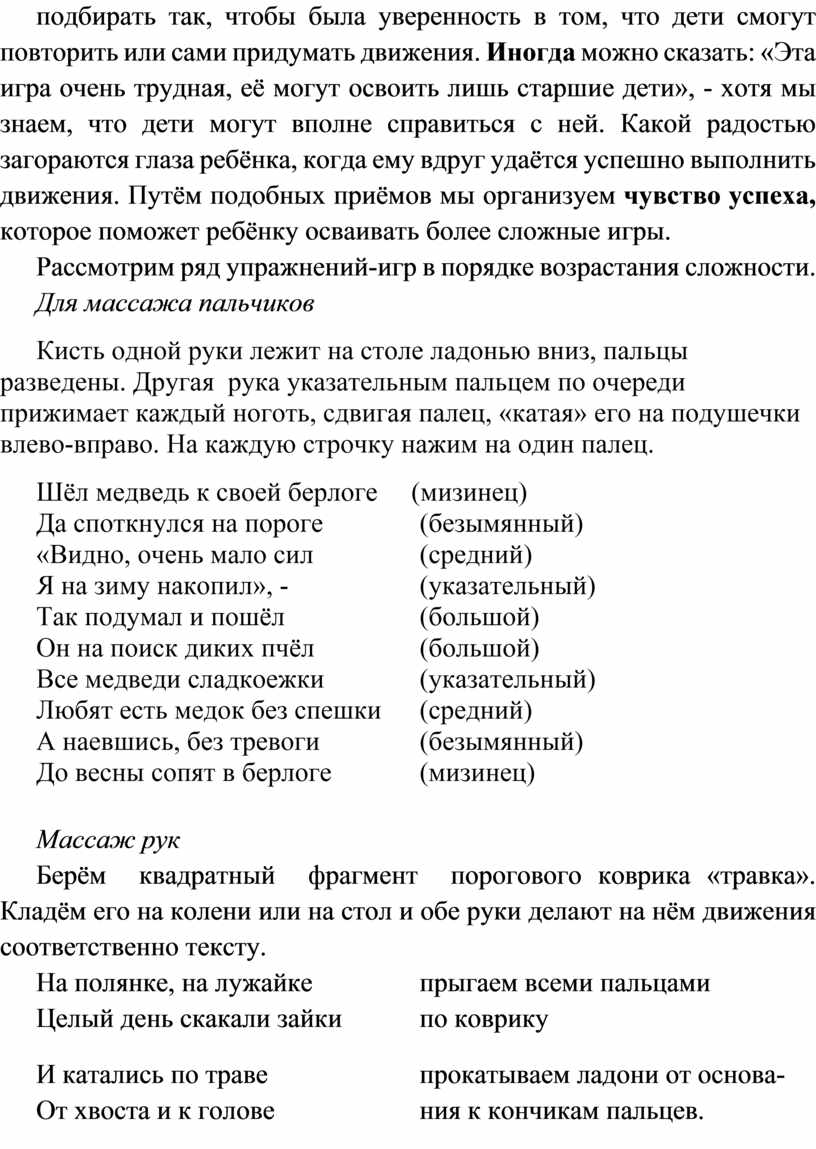 Очень важно, чтобы у ребёнка не было бы зажатости, страха за то, что упражнения сложны, недоступны (упр. «танец», «паучок»). Важно, чтобы ребёнок не растерялся. Поэтому упражнения нужно подбирать так, чтобы была уверенность в том, что дети смогут повторить или сами придумать движения. Иногда можно сказать: «Эта игра очень трудная, её могут освоить лишь старшие дети», - хотя мы знаем, что дети могут вполне справиться с ней. Какой радостью загораются глаза ребёнка, когда ему вдруг удаётся успешно выполнить движения. Путём подобных приёмов мы организуем чувство успеха, которое поможет ребёнку осваивать более сложные игры.