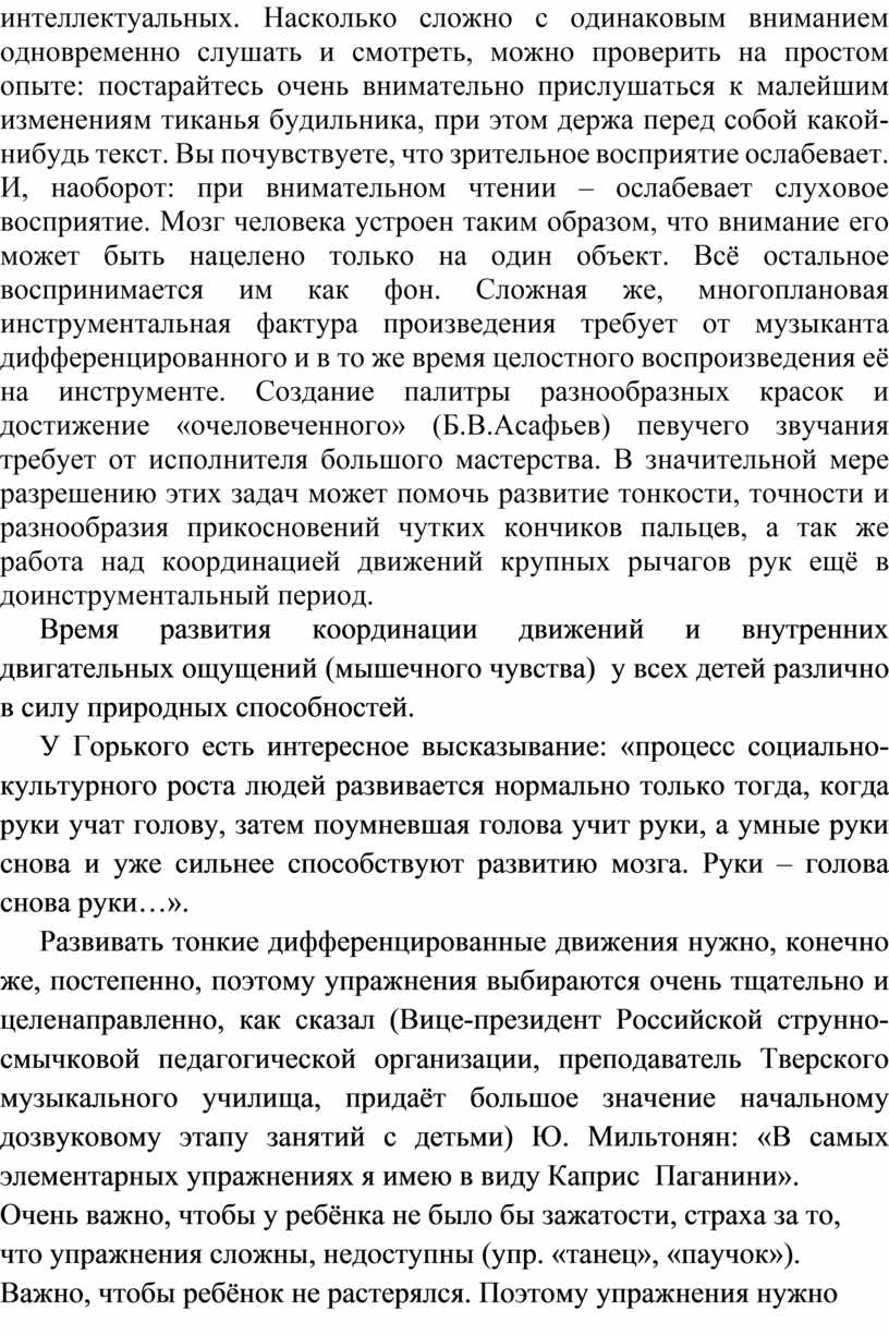 Развивать тонкие дифференцированные движения нужно, конечно же, постепенно, поэтому упражнения выбираются очень тщательно и целенаправленно, как сказал (Вице-президент Российской струнно-смычковой педагогической организации, преподаватель Тверского музыкального училища, придаёт большое значение начальному дозвуковому этапу занятий с детьми) Ю. Мильтонян: «В самых элементарных упражнениях я имею в виду Каприс Паганини».