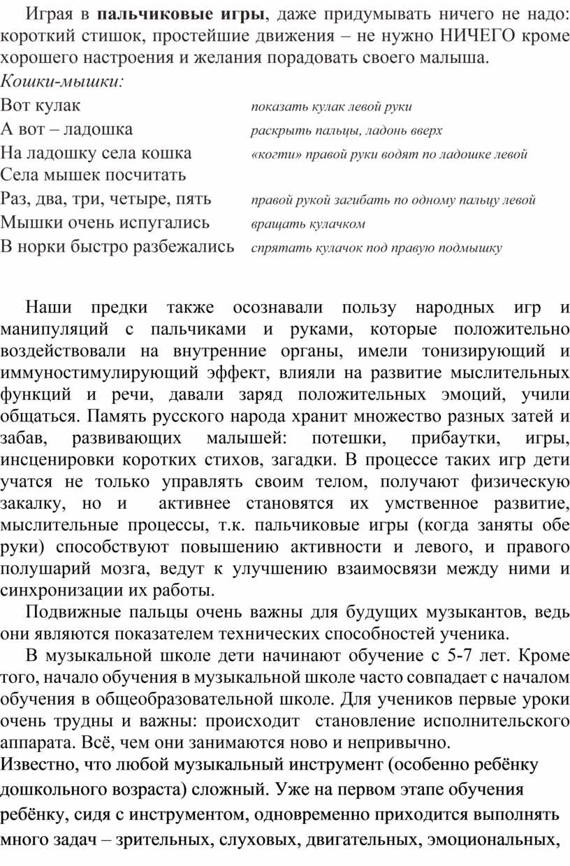 Рассмотрим роль пальчиковых игр в формировании навыков у начинающих музыкантов.