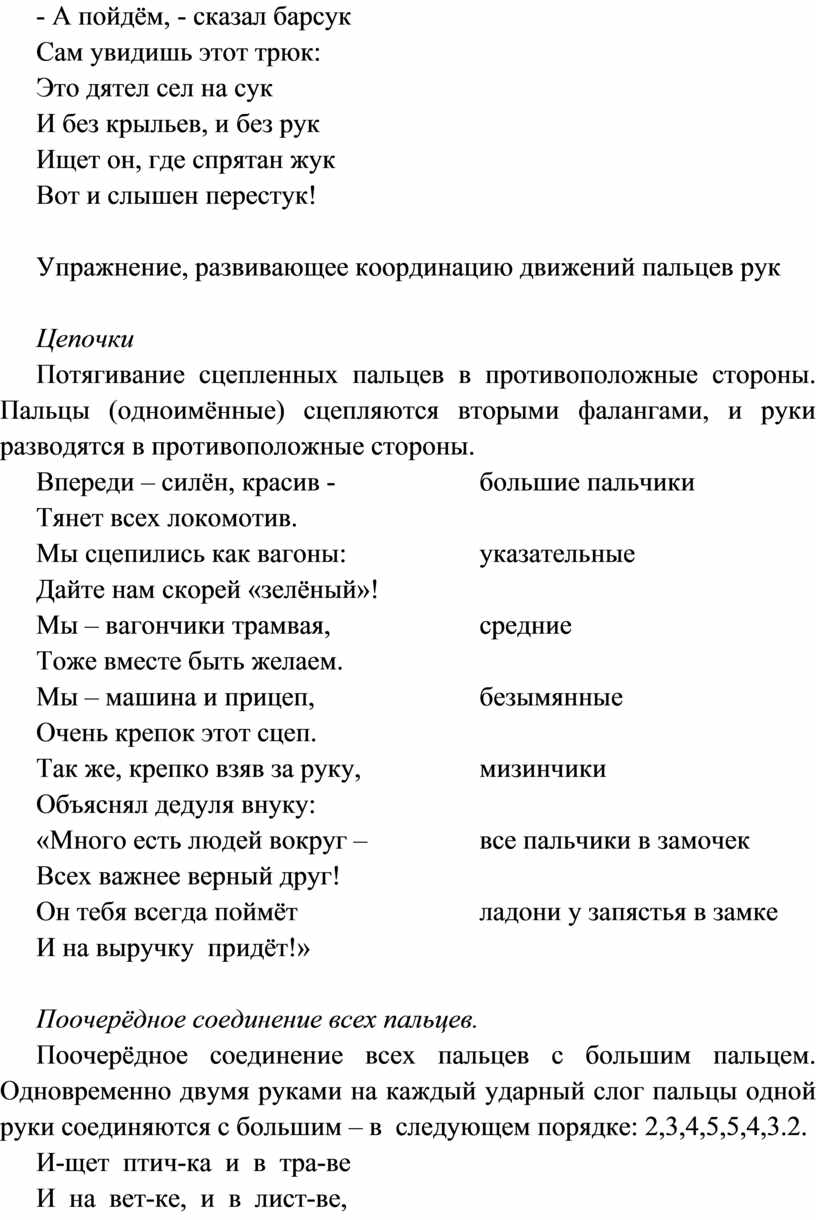 Поочерёдное соединение всех пальцев с большим пальцем. Одновременно двумя руками на каждый ударный слог пальцы одной руки соединяются с большим – в следующем порядке: 2,3,4,5,5,4,3.2.
