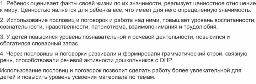 4. Через пословицы и поговорки развивали и формировали грамматический строй, связную речь, способствовали речевой активности дошкольников с ОНР.