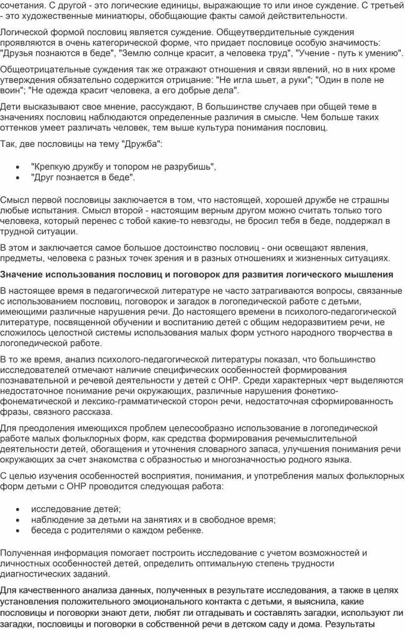 В настоящее время в педагогической литературе не часто затрагиваются вопросы, связанные с использованием пословиц, поговорок и загадок в логопедической работе с детьми, имеющими различные нарушения речи. До настоящего времени в психолого-педагогической литературе, посвященной обучении и воспитанию детей с общим недоразвитием речи, не сложилось целостной системы использования малых форм устного народного творчества в логопедической работе.
