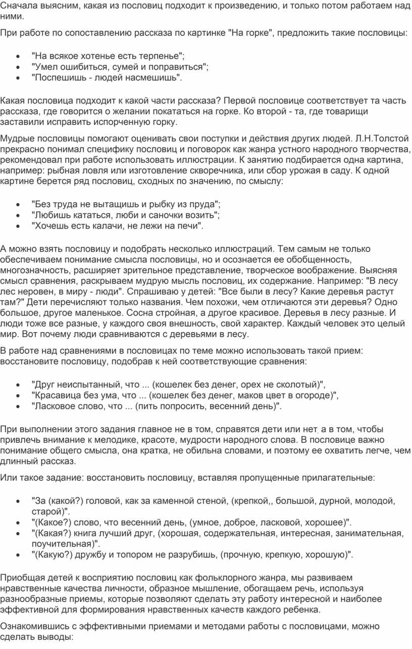 Приобщая детей к восприятию пословиц как фольклорного жанра, мы развиваем нравственные качества личности, образное мышление, обогащаем речь, используя разнообразные приемы, которые позволяют сделать эту работу интересной и наиболее эффективной для формирования нравственных качеств каждого ребенка.