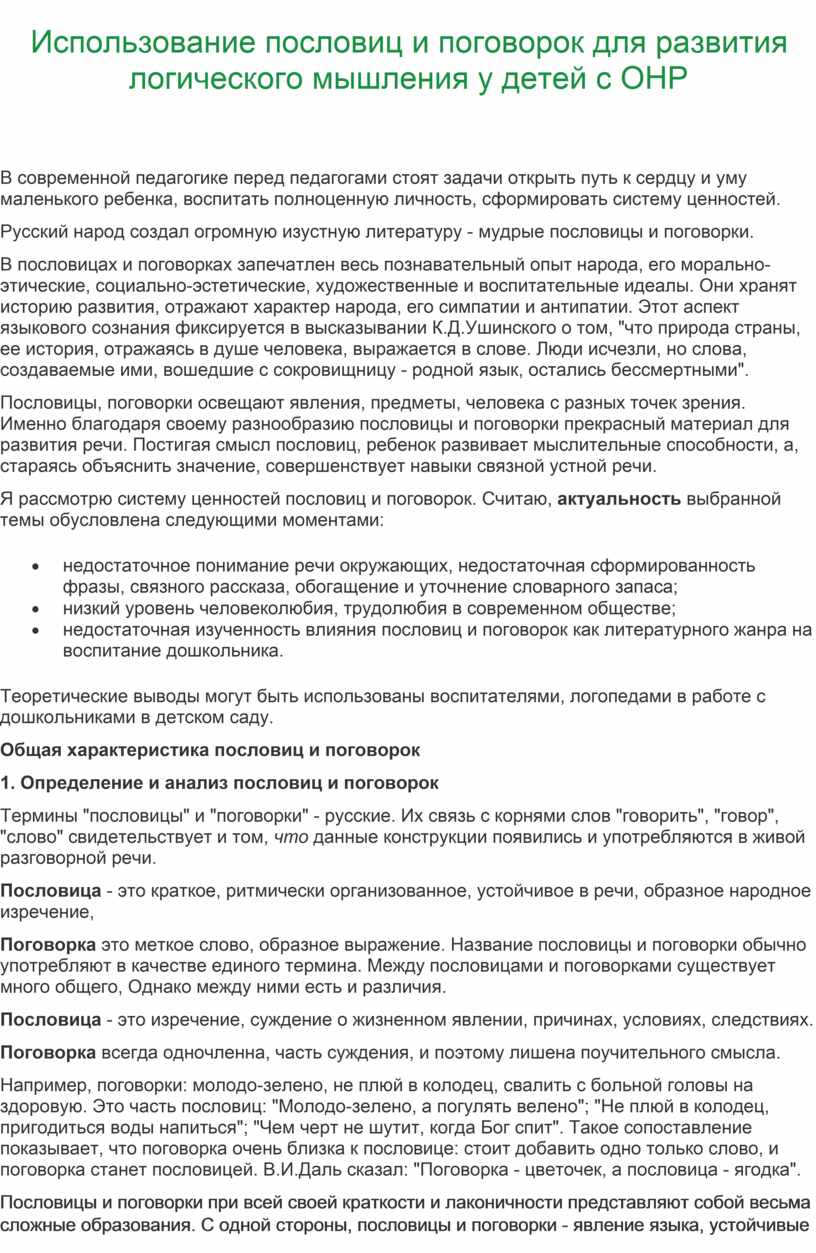 Использование пословиц и поговорок для развития логического мышления у детей с ОНР