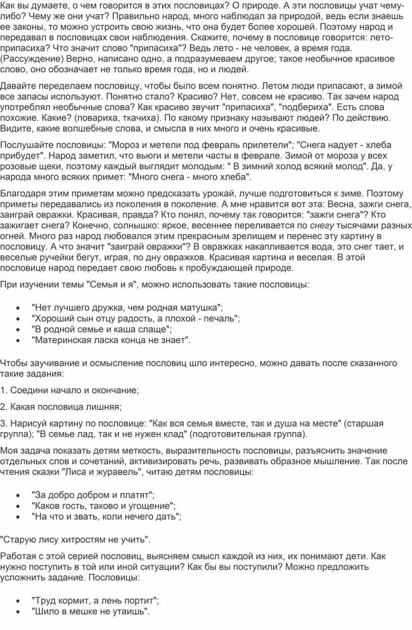 Моя задача показать детям меткость, выразительность пословицы, разъяснить значение отдельных слов и сочетаний, активизировать речь, развивать образное мышление. Так после чтения сказки "Лиса и журавель", читаю детям пословицы: